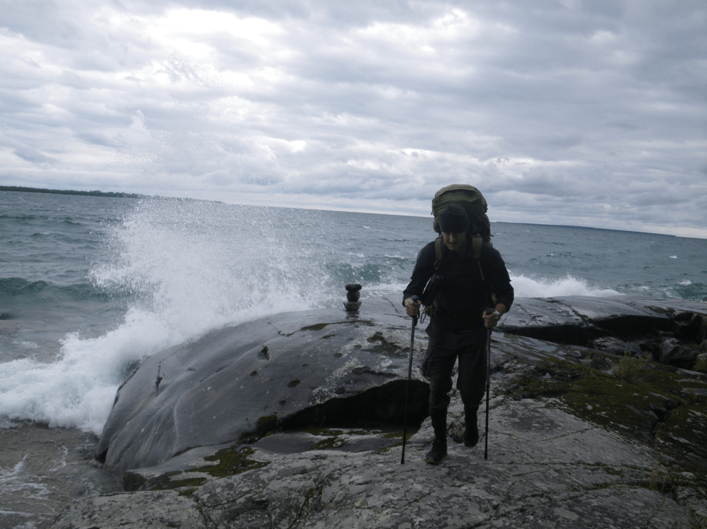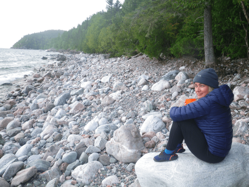 We woke up to rain on our third day.. and I mean it was down right pouring by the time we were less than an hour into the way to Beatty Cove. This did not seem to affect us as we were so happy to be on our way… it did however make the hike very challenging. Wet rocks that are very slippery with a heavy pack and very high winds slowed us down quite a bit. Hurricane Ida was following the coast during our time on the trail and made for some big waves as well. This section was the hardest area of the trail for us. There are some very high cliffs made of smooth rock that if you fall … well your going into Lake Superior. I want to make it clear that there are parts of this trial you can get seriously injured if you were to fall. We were hiking very slowly over some areas in this section. We made a rookie mistake and took off our rain gear because we were sweating so much from working so hard hiking.. It took us 7 hours to make it to Beatty cove. ( I think you could make it in 5ish on a clear day) we arrived at Beatty cove and once we stopped moving…we started freezing.. oh no… so we put our tent up in pouring driving rain.. changed our clothes and put all our warmest gear on and made Mr Noodles to just have something warm….I have never been so soaked to the bone cold while in the woods.. we just felt this is part of the experience…was it our worst night..yes. But we didn’t complain. We went to bed early.. I was glad to be just warmer than I was all day….we woke up to more rain but had amazing hot coffee and breakfast …packed up all our soaked and muddy gear and trekked on…. Lol