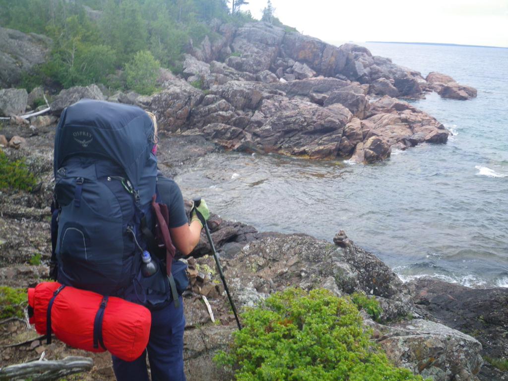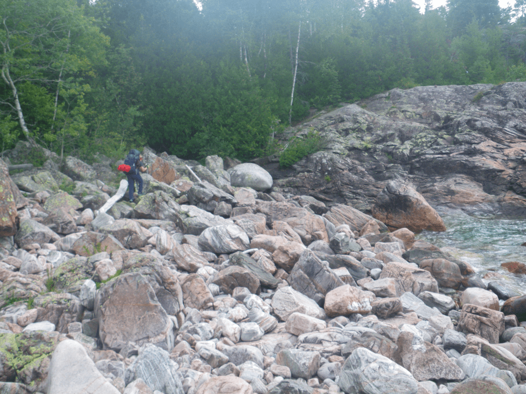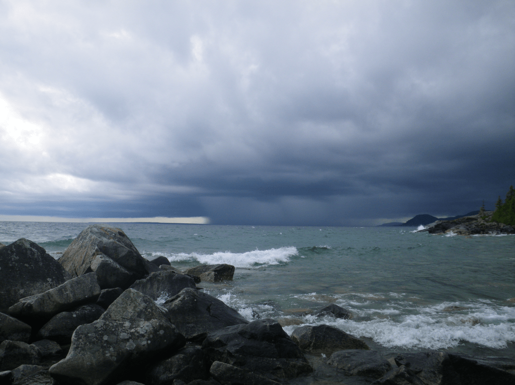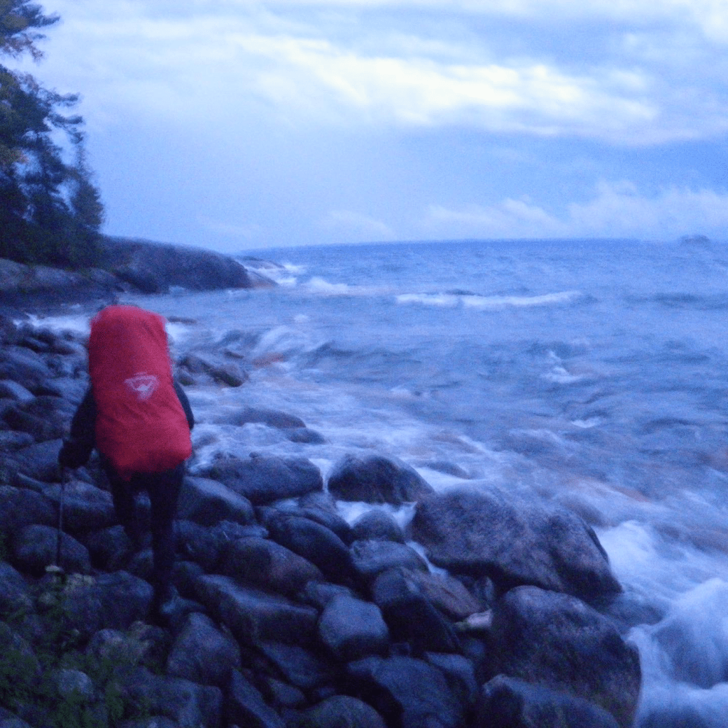 We were on the way to Robertson Cove.. I couldn’t wait.. I have been seeing this site on line for a while and I was sooo excited … this is also the day.. I had a major fall. Think of the show wipeout… yup that was me… so as the rain was clearing up the top of the rocks were starting to dry.. and I was becoming more confident in my ability to rock scramble.. So what went wrong? Riiight…. So I was using my trekking pole to stabilize.. my pole slipped and we were on rocks about the size an avg car.. my pole slipped into a hole and I face planted on a rock.. I heard my head crack on the rock and was stunned for a few mins… I had a goose egg, and a black eye by that night… I am a nurse and gave some important information to my husband ( things to look out for that would mean we would have to leave and get medical help ) and I consider myself to be very lucky I didn’t even have concussion symptoms… that being said.. its been almost a month since we finished the trail.. and I still have a small lump on my head.. and its still a bit sore… back to the trail… so we arrived at Robertson Cove and on a nice day…this place would be amazing… for us.. it was storming, we had to put our tent up back near the privy … we watched storms move into shore off the lake.. waves were really high as well…. We met a few hikers as the trail goes though the site.. great fire pit here as well…